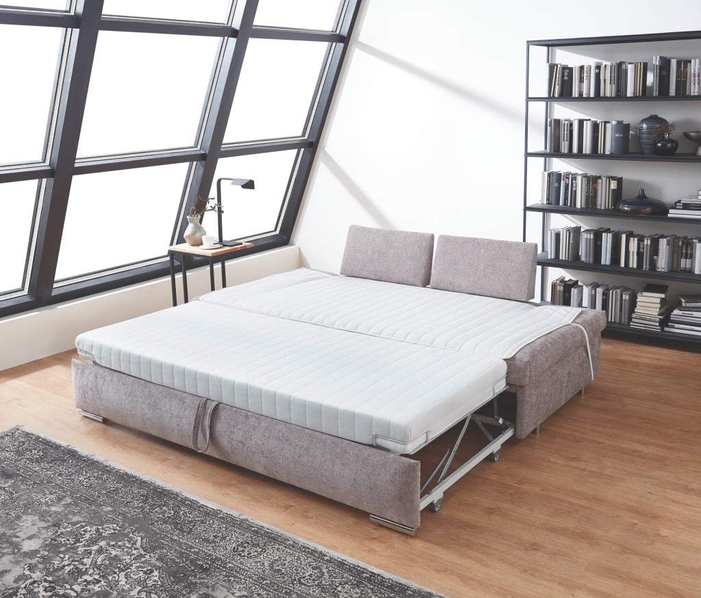 Stoff 8-8004, Farbe blau, Metallfuß chrom (668) 2615 - Schlafsofa, inkl. Lattenrost und Armlehn- und Sitztiefenverstellung, Liegefläche 175 x200 cm