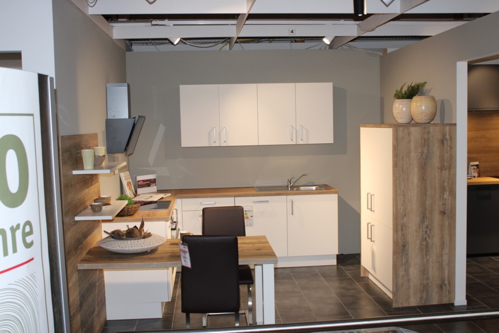 Prisma Musterküche in Magnolia softmatt & Arizona Pine Nachbildung
