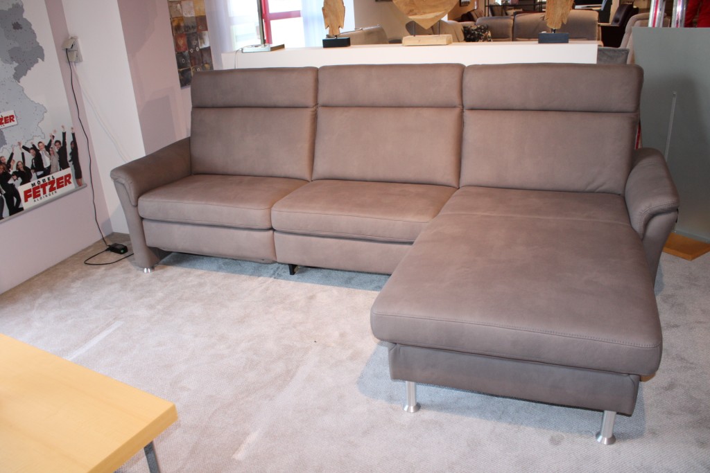 1x Gruber Polstergarnitur, Modell: Carmen, Bezug: Mammut Elefant, Sitzhöhe: 46 cm, Stellmaß: 274 x 166 cm, Sitztiefe: 53 cm.