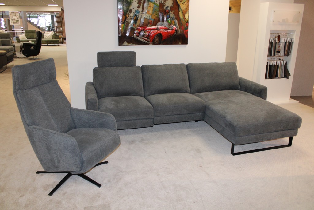 1x DFM Polstergarnitur, Modell: Cadiz, Bezug: Clever gray, Sitzhöhe 45 cm, Sitz: Taschenfederkern, Metallfuß schwarz, motorische Relaxfunktion
