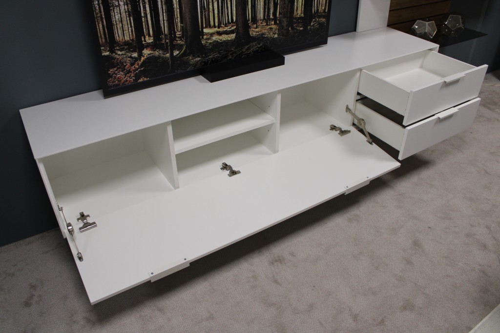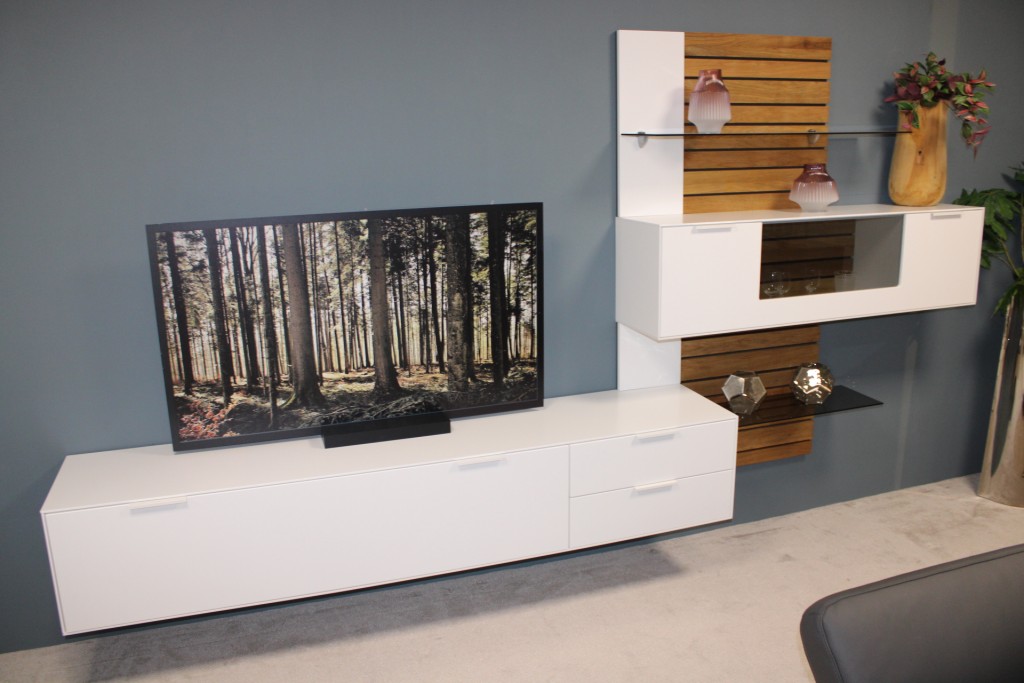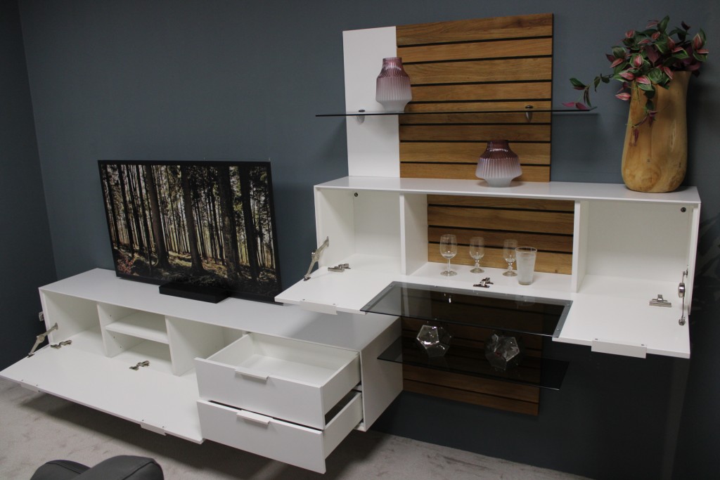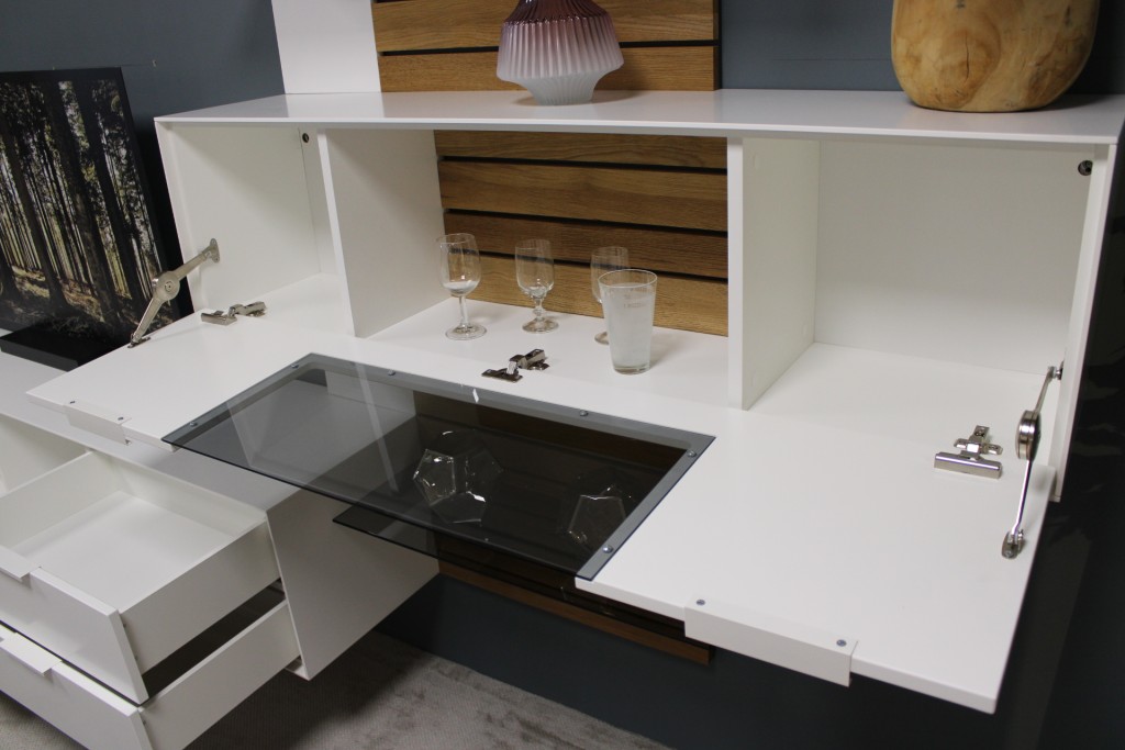 1x Quadrato Wohnwandkombination, Modell: Caspara Casada, in Lack Weiß / Absetzung Eiche massiv bianco geölt,