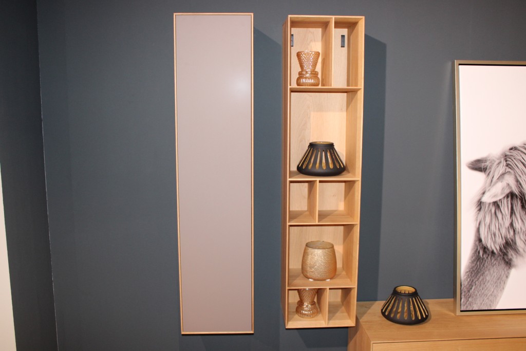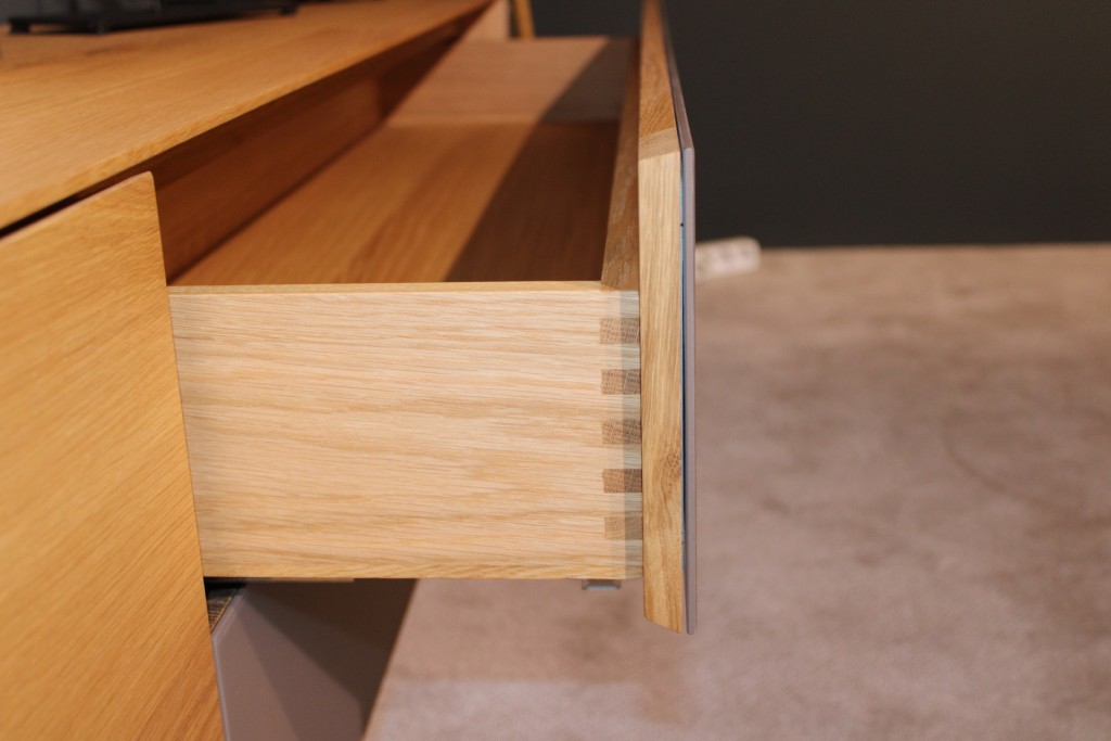 Massive Wohnwand in Eiche geölt / Glastüren Absetzungen Satinato Taupe.