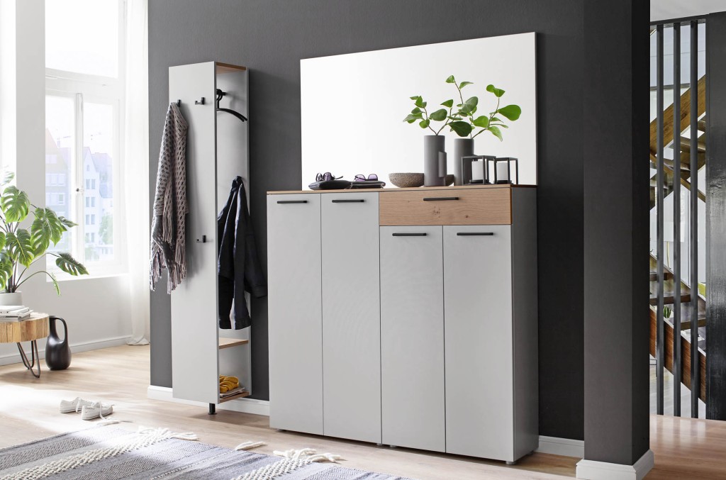 Kombi No.30 Wildeiche Bianco Furnier Fronten grau Lack Griffe-/Metallteile: schwarz matt bestehend aus: PAL-845 - Garderobenpaneel, PAL-K300 - Kommode , PAL-903 - Fachboden, 5 x PAL-923 - Antirutschmatte, PAL-K302 - Kommode, PAL-B136 - Abdeckblatt, PAL-705 - Spiegel